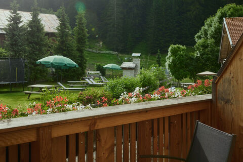 Zum Haus gehört eine Sonnenterrasse, die Liegewiese und der Kinderspielplatz. Im Tiefparterre befinden sich Garage, Skiraum und unser kleiner Wellness-Bereich: Bio-Sauna, Relax-Liegen
