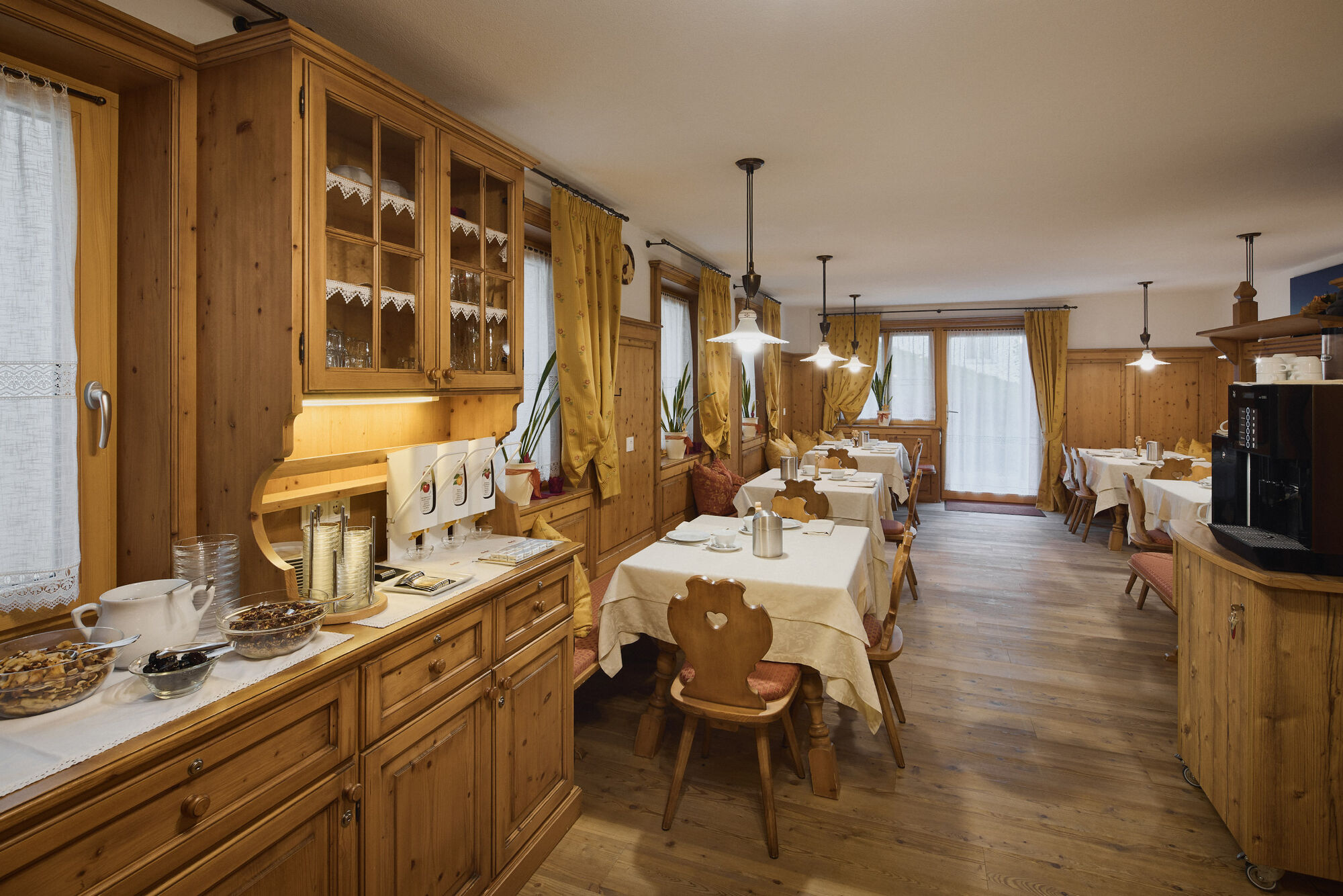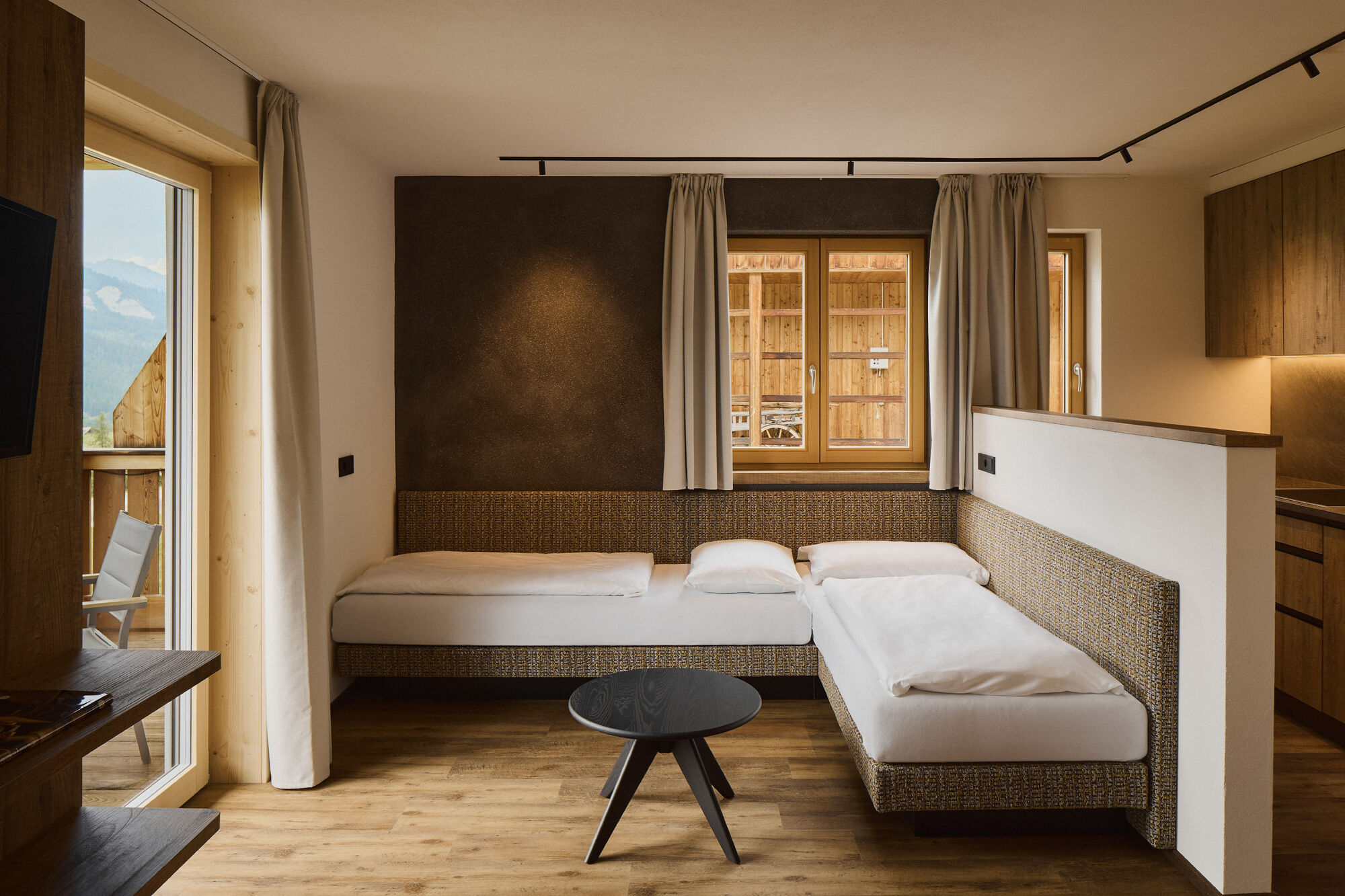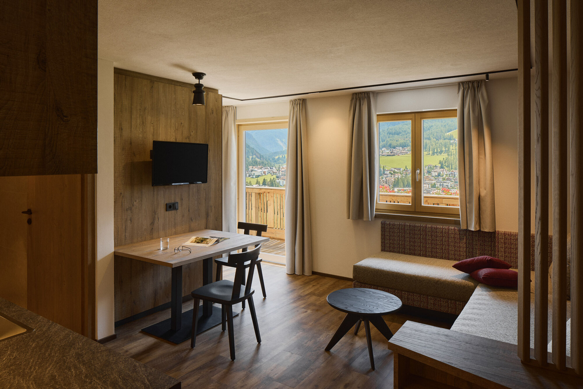 Unsere Appartements sind großzügig geplant und hochwertig eingerichtet: alle Möbel aus massivem Fichtenholz, funktionale und gut ausgestattete Küchenzeilen, moderne und komfortable Bäder. Alle haben einen Balkon mit herrlichem Ausblick auf die Bergwelt der Dolomiten.
