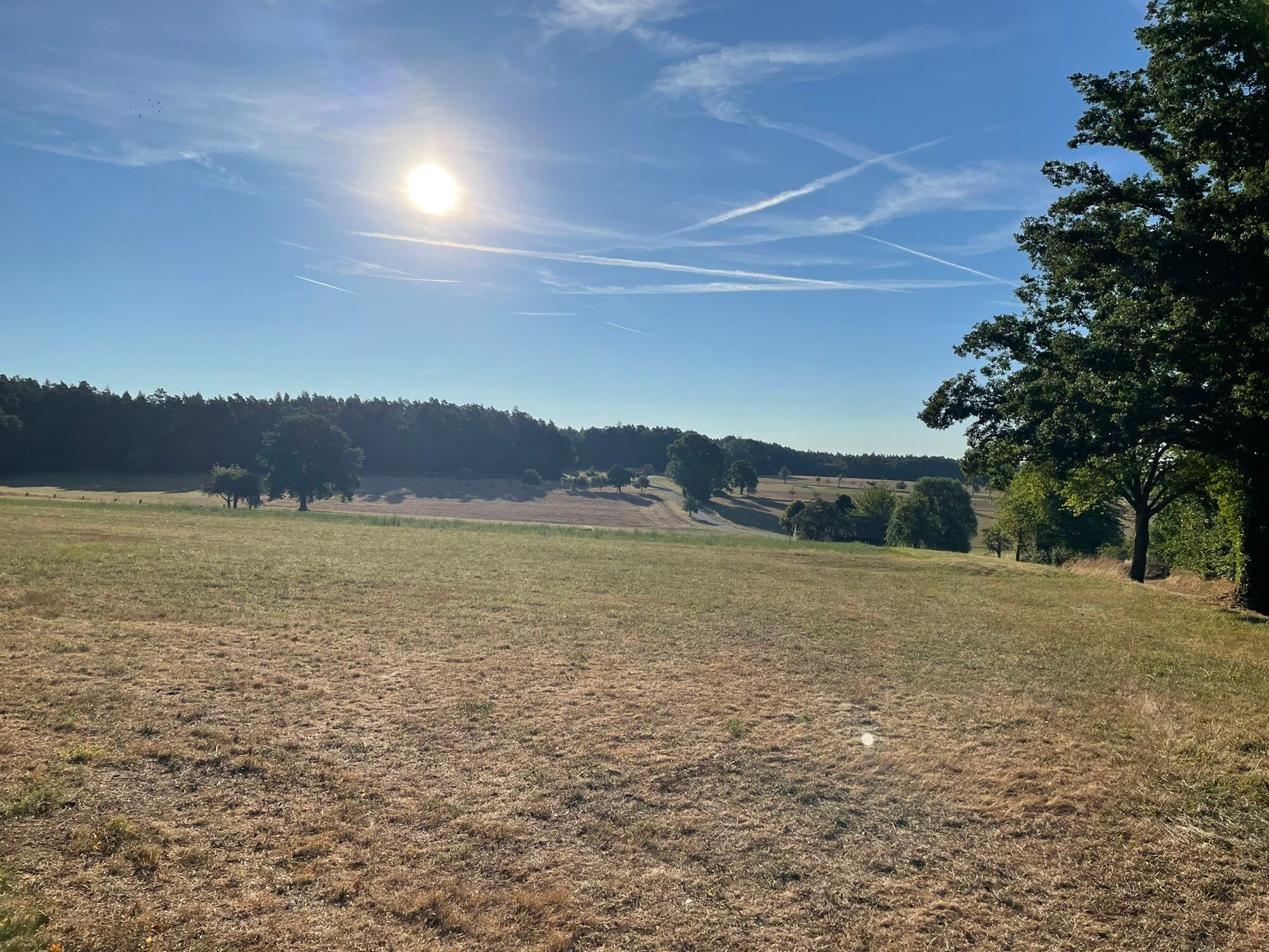 Wir lassen die letzten Häuser Embergs hinter uns, gehen durch weite Felder und an einzelnen Bäumen vorbei und wenden uns dann nach rechts auf einen bergabführenden Weg in den Wald. An der folgenden Kreuzung nehmen wir den Abzweig nach links, um zum Wegweiserstandort Berghütte zu gelangen. Hier lohnt sich ein Abstecher zur Berghütte, um von dort die Aussicht zu genießen.