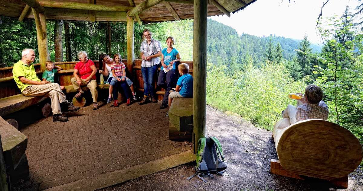 Nach einer wohlverdienten Rast folgen wir der Straße in Richtung Rötenbach, betreten den Wald und biegen rund 600 m später nach rechts ab. Bis zu unserem Ausgangspunkt ist es nun nicht mehr weit, und auf dem Waldweg zurück zum AugenBlick Zettelberg schwelgen wir in den jungen Erinnerungen einer hinreißenden Wanderung.