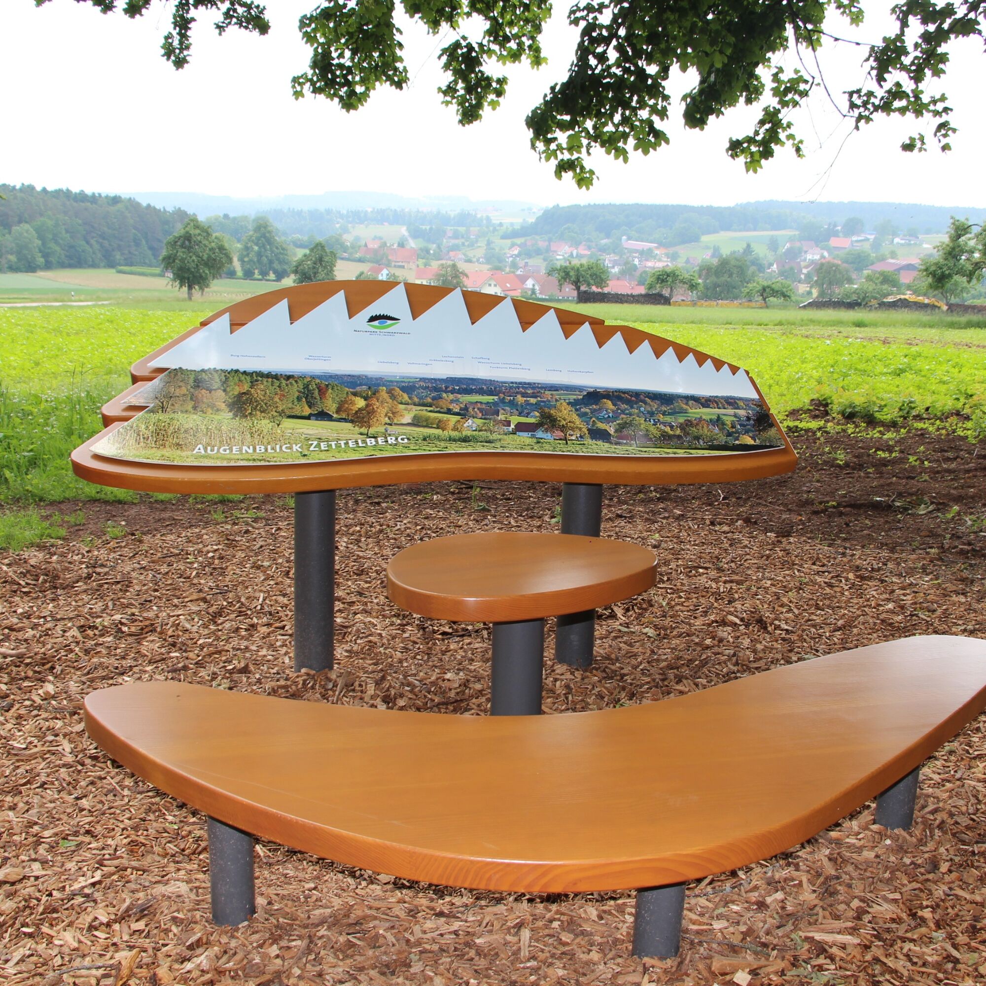 Der AugenBlick Zettelberg, Aussichtspunkt sowie Start und Ziel unserer Tour, ist ein großartiger Ort, um eine Wanderung zu beginnen. Ganz nah, malerisch im Tal gelegen und teilweise hinter knorrigen Bäumen versteckt, befindet sich die Ortschaft Rötenbach, die vom saftigen Grün der Wiesenlandschaft umrahmt wird. Und wenn wir über einige Wälder hinweg weiter in die Ferne schauen, dann genießen wir den Blick auf die Schwäbische Alb. Lemberg, Hohenkarpfen, Lochenstein, Plettenberg – um nur einige sanft geschwungene Erhebungen zu nennen, die unserem Auge offenbart werden. Highlight bei klarem Wetter ist die Sicht auf die Burg Hohenzollern zu unserer Linken. Wie schön, dass wir diesen Ort bei unserer Rückkehr noch einmal beehren können!