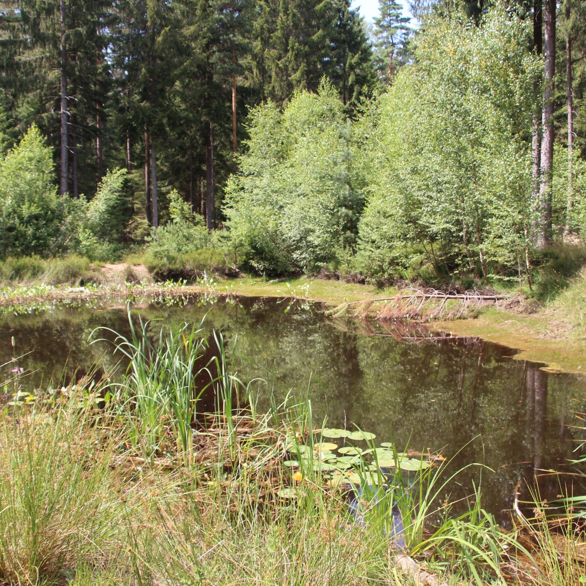 Schließlich starten wir unsere Wanderung, tauchen in die angenehme Frische des Waldes ein und folgen dem Naturpark-AugenBlick-Symbol sowie den Rauten des Schwarzwaldvereins. Auf breitem Wege gelangen wir nach 200 m an eine Weggabelung, halten uns dort links und treffen so auf ein kleines Biotop. Wenn wir Glück haben, können wir auf der schimmernden Oberfläche einige verschiedene Wasservögel beobachten! Dann führt uns der Weg nach links und bald darauf aus dem Wald heraus. An der nächsten Möglichkeit halten wir uns links und wandern gemütlich bergab. Ca. 400 m weiter biegen wir erneut nach links ab und wandern am Schützenhaus vorbei. So gelangen wir auf einen schönen Abschnitt am Waldrand entlang und können abermals die herrliche Landschaft betrachten.
