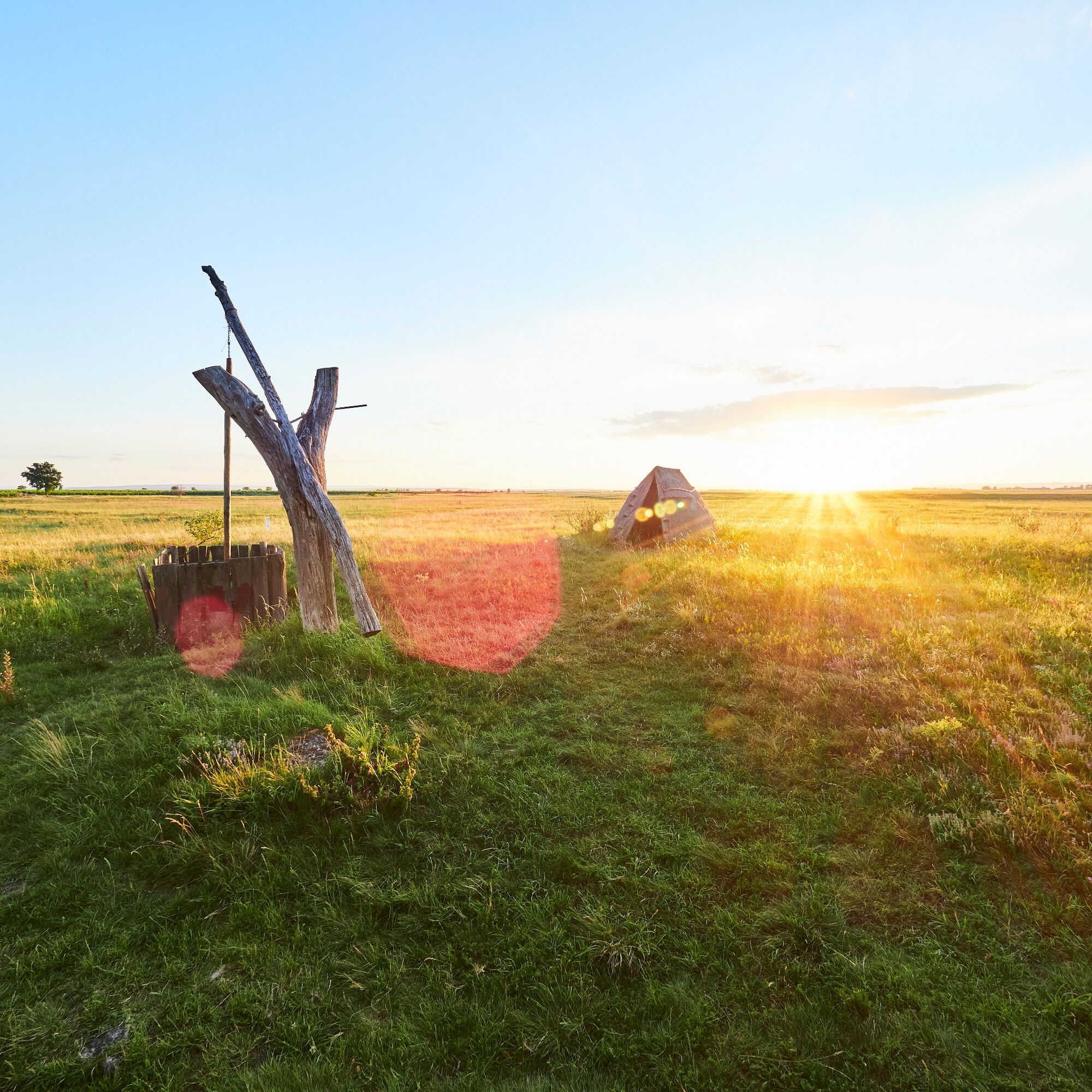 Bevor Sie in den Ort Illmitz gelangen, kommen Sie an einem wunderschönen, pannonisch anmutenden Platz, mit Ziehbrunnen und Hütte aus Schilf vorbei. In einer solchen Hütte haben früher die “Hoider”, Halter gewohnt, die auf die Pferde, Rinder und Schweine aufpassten.