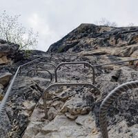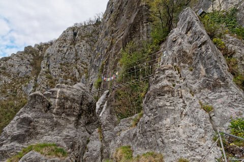 Eine wunderbare Nepalbrücke zu einem Aussichtsfels neben dem (trockenen) Wasserfall und senkrechte Eisenwände bringen tolle Eindrücke.