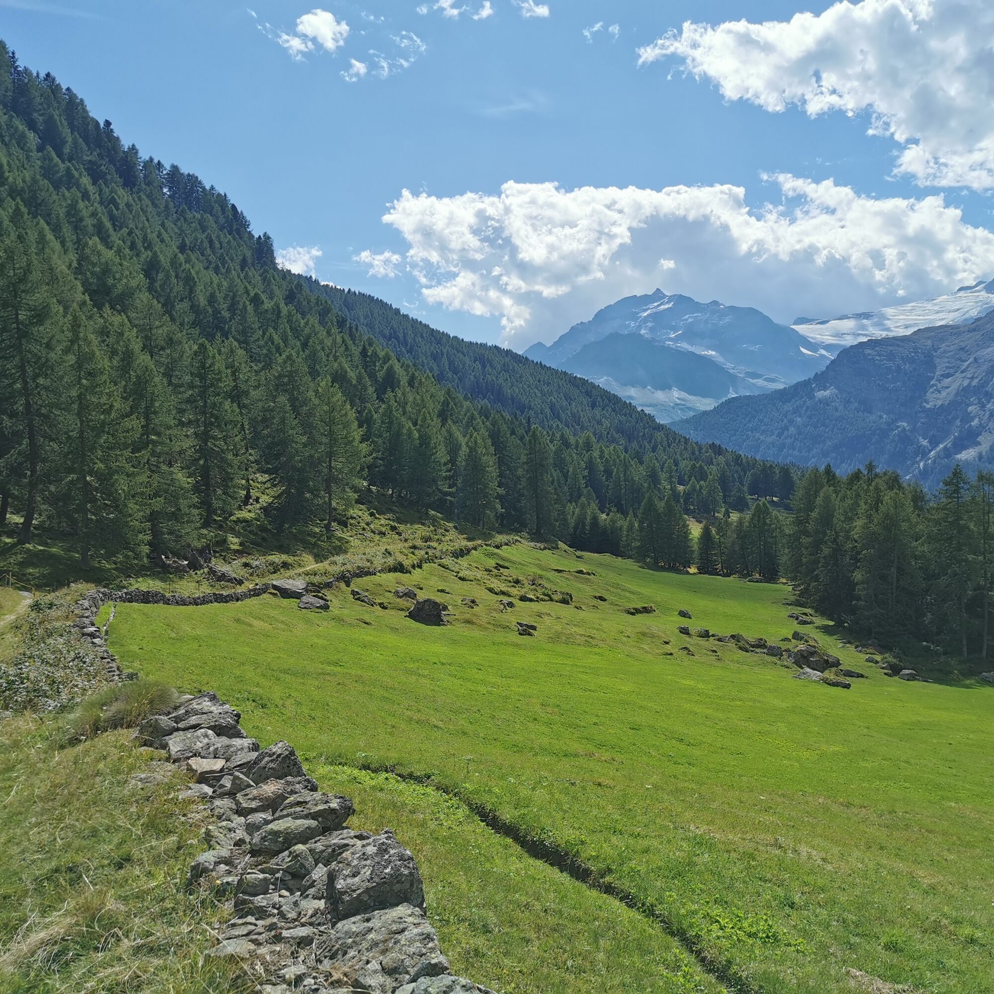 Von Aurafreida gelangt man zunächst durch lichten Lärchenwald, dann über eine felsige Geländestufe ins Val dal Teo, wo man schon bald das Ufer des Lagh dal Teo erreicht.