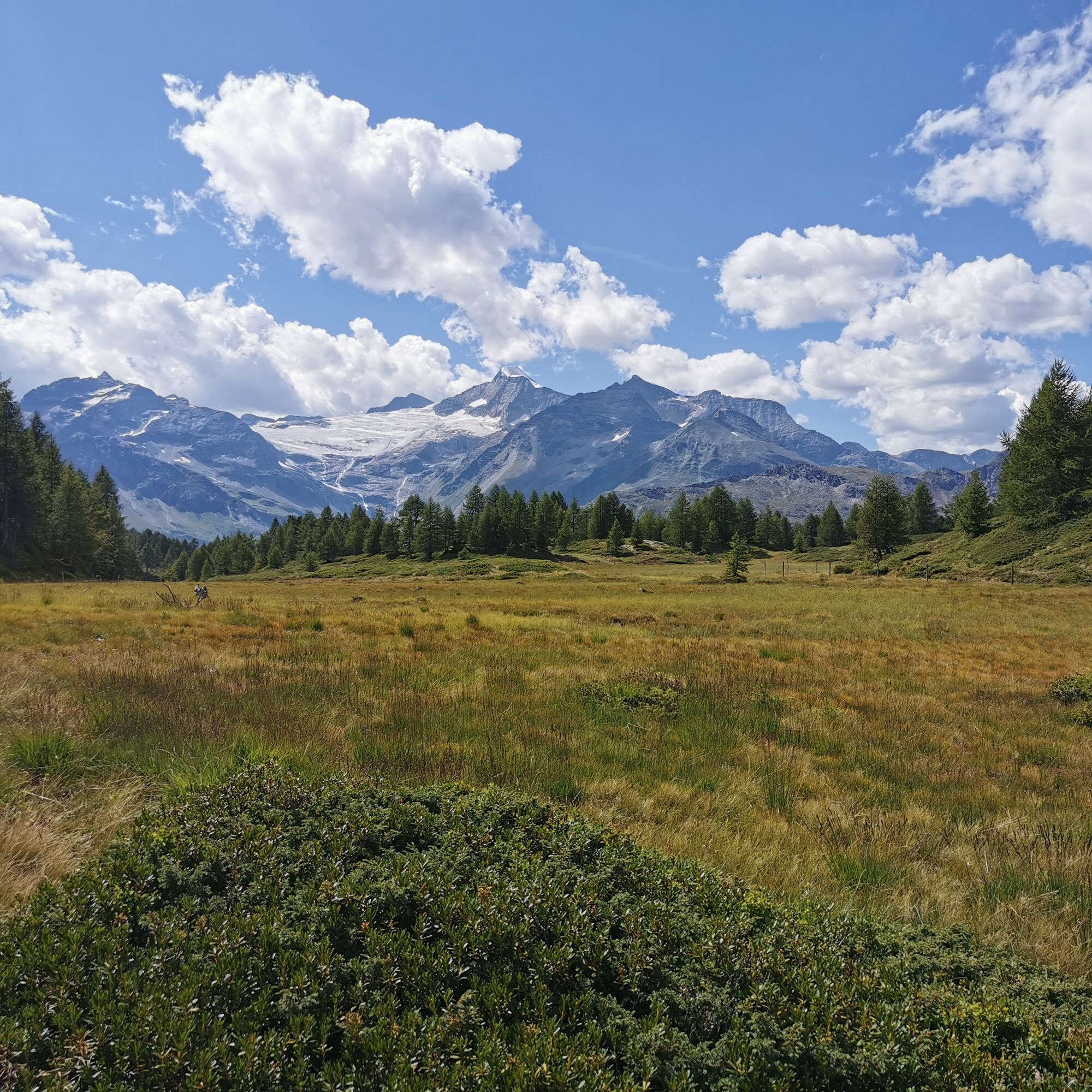 Zum Auftakt geht es im idyllischen Val da Camp zum Weiler Terzana, von dort steil hinauf zur Moorlandschaft von Munt da Franzesch, wo sich über dem rotgolden leuchtenden Riedgras die vergletscherte Flanke des Piz Palü auf der gegenüberliegenden Talseite der Valposchiavo zeigt.