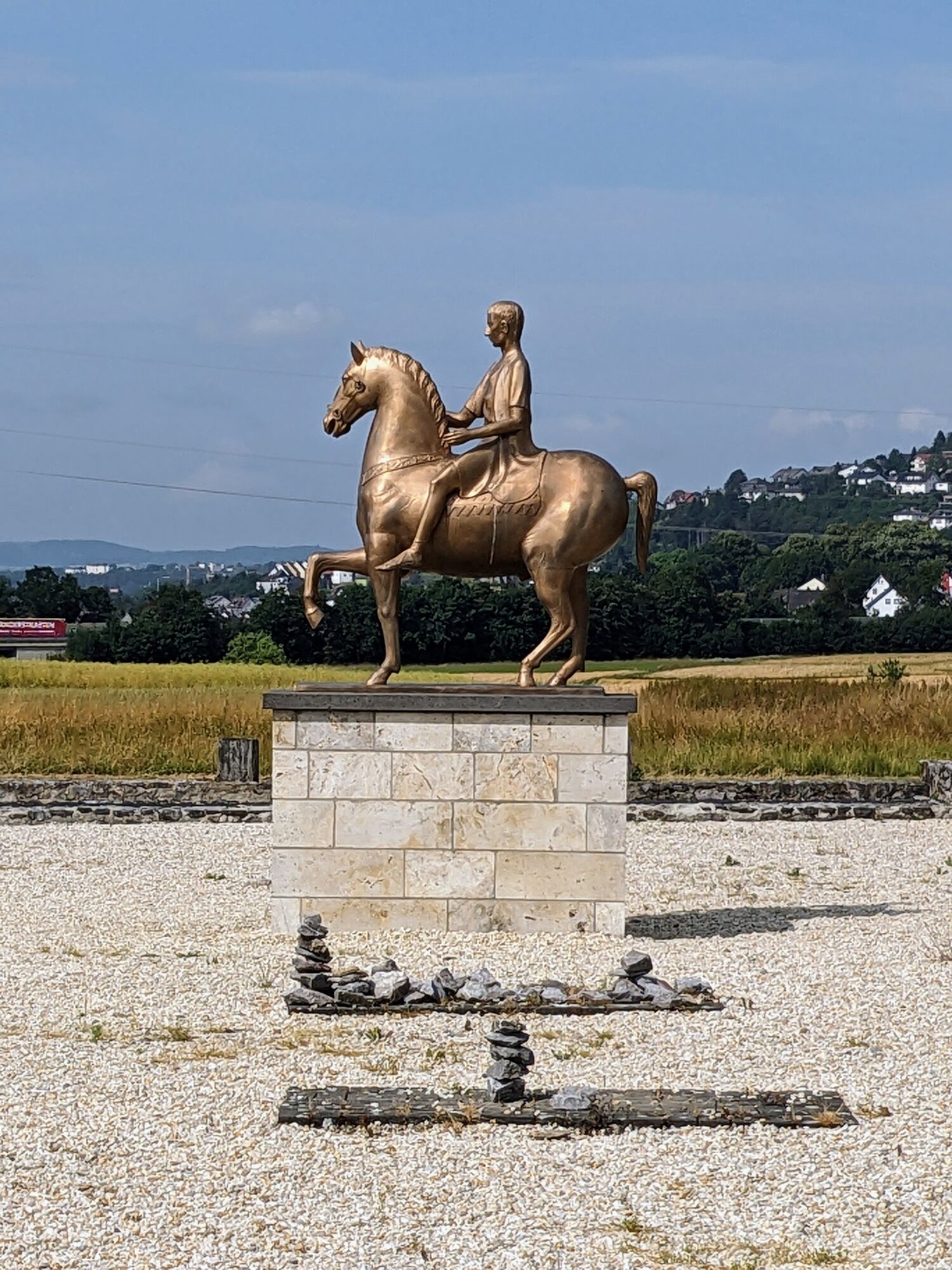 Vom Kirchenplatz aus führt die Tour in Richtung Lahn, die Marktstraße und Neustadt entlang. Am Oswaldsgarten an der Hauptstraße diese an der Ampel überqueren und unter der Bahnbrücke durchfahren. Direkt dahinter rechts einbiegen und vor dem Seniorenwohnheim lins an die Lahn und an dieser entlangfahren. Ein paar Meter hinter der Bootsrutsche links auf die Lahnstraße fahren und bei der nächsten Möglichkeit gleich wieder den Weg rechts (Vorsicht, enge Kurve), an der Wieseck wieder links zurück an die Lahn nehmen. Der Lahn entlang der Lahnwiesen weiter folgen. Hinter dem Klärwerk links halten und dem Weg bis zur rechter Hand liegenden Unterführung folgen. Durch die Unterführung fahren, dahinter direkt links. Dem Weg parallel zur B49 weiter folgen, an den Seen vorbei durch die Lahnauen zwischen Atzbach und Gießen, bis kurz hinter der Schleuse in Dorlar. Ein Blick über die Lahn lohnt sich, direkt auf die Dorlarer Kirche. Kurz den Weg weiter folgen bis zur Hauptstraße. Hier rechts auf die Wetzlarer Straße über die Brücke fahren und in der abknickenden Vorfahrtstraße links in die Hinterstraße. Nach ein paar Metern rechts in die Friedhofstraße abbiegen. Der Friedhofstraße bis zum Viadukt folgen. Hinter der Unterführung der ehemaligen Kanonenbahn-Trasse links den Weg an den Wiesen und Feldern entlang nach Waldgirmes nehmen. Am Kiosk vorbei dem geteerten Weg rechts folgen, am Schwimmbadparkplatz links, an der Lahnauhalle vorbei. Hinter den Fußballplätzen rechts abbiegen (Vor dem Polstück). Dem Weg bis zur Hauptstraße folgen, hier links und direkt rechts auf den Radweg fahren, dann links hoch zum römischen Forum. Alternativ an der Hauptstraße rechts und gleich die nächste Straße wieder links Zum Römischen Forum fahren. Dem Weg bis zum Römischen Forum folgen.