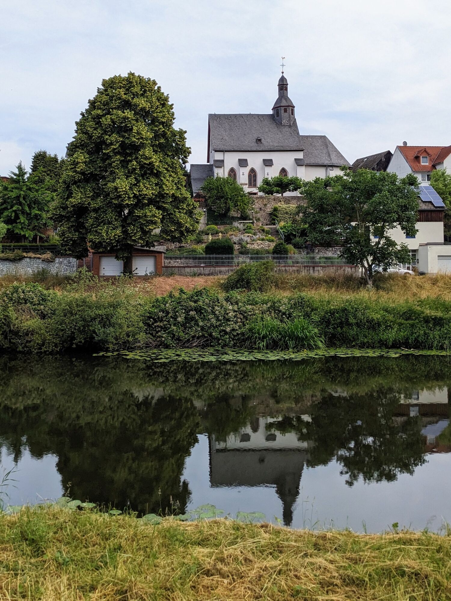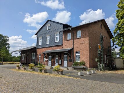 Für den Rückweg geht es zurück an die Hauptstraße, hier links in die Naunheimer Straße abbiegen. Wer sich ein Eis gönnen möchte, ist bei der Eisdiele "Eiszeit" genau richtig. Auch ein kleiner Obst- oder Gemüsesnack kann hier an der Hauptstraße in Martins Hofladen besorgt werden. Der Hauptstraße durch das Dorf folgen bis zur Fußgängerampel vor der Bushaltestelle. Hinter der Ampel rechts abbiegen und den geteerten Weg hinter der Bushaltestelle entlang fahren. Kurz vor dem nächsten Ort (Dorlar) rechts dem breiten geteerten Weg folgen. Dieser führt wieder durch die Unterführung der ehemaligen Kanonenbahn-Trasse auf die Friedhofsstraße. Kurz vor dem Dorlarer Friedhof rechts in den Münchgraben abbiegen. Dann wieder rechts, gleich wieder links und wieder links an die Lahn an den Lahnradweg (Richtung Gießen) in den Mühlweg fahren. Diesem Weg unter der Brücke hindurch folgen. Der Mühlweg geht in den Wiesenweg über. Vor den Feldern rechts abbiegen und weiter auf dem Lahnradweg bleiben. Der Weg führt ein Stück direkt an der Lahn entlang durch Wiesen und Felder. Bei der nächsten Kreuzung links in die Lahnstraße einbiegen, an der Kirche Atzbach vorbei bis zur Hauptstraße. Dort rechts abbiegen und direkt wieder lins in den Dreihäuser Platz. Links halten in die Steinstraße - dieser ein Stück folgen bis recht ein unbefestigter, schmaler Weg kommt. Hier bitte absteigen und die gut 500 Meter schieben. Der Weg führt direkt an der ehemaligen Kanonenbahn entlang, vorbei am ehemaligen Atzbacher Bahnhof. * Nach einigen Metern endet der schmale Weg und man kann links in den ausgeschilderten Radweg (auch Lahnradweg) Richtung Heuchelheim abbiegen. Hier fährt man bis Heuchelheim weiter parallel zur ehemalligen Trasse der Kanonenbahn. Links halten auf die Bahnhofstraße. Nach ein paar Metern befindet sich links der ehemalige Bahnhof Heuchelheim-Kinzenbach, der heute als Heimatmuseum dient. Auch eine alte Bahn kann man hier begutachten.