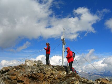 Bald geht es wieder steiler bergauf. Die Wiesen gehen in Geröll und steinige Wege über. Nach der letzten Biegung liegt ein Schneefeld vor Ihnen (Überreste eines Gletschers) das leicht zu überqueren ist und er letzte Aufstieg steht bevor. Das wunderschöne Gipfelkreuz ist schon in greifbarer Nähe!