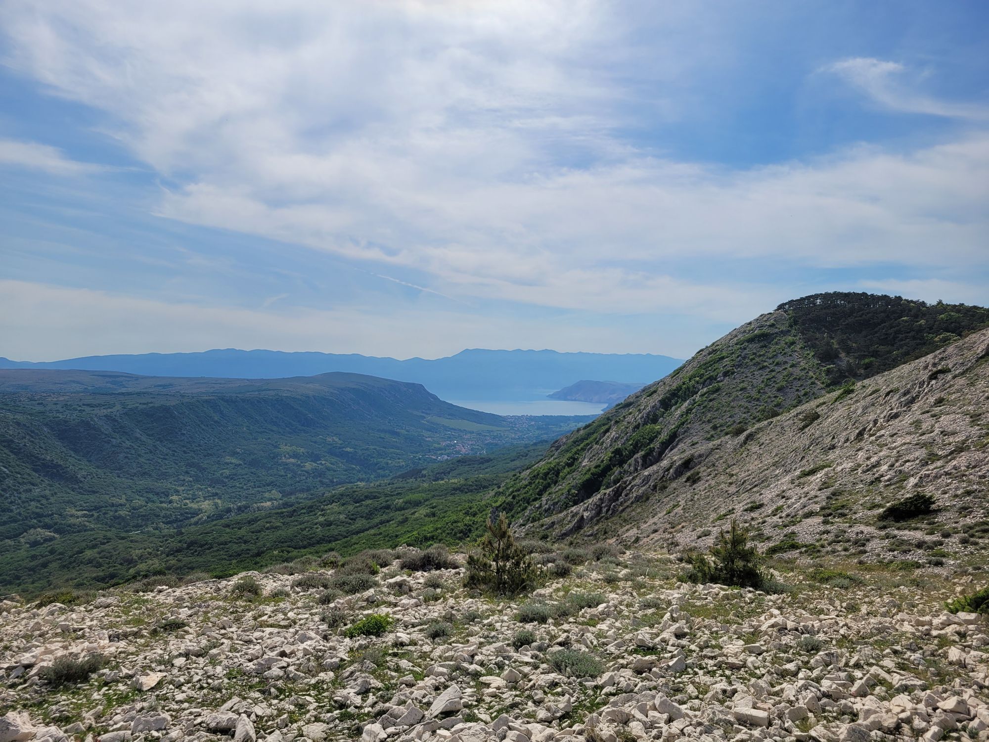 Zu Fuß entweder wild oder rechts den markierten Weg auf den Veli Vrh. Dies ist ein sehr felsiger und steiniger Hügel, mit dem lustig gesprayten Betonsockel an der Spitze, wo ich auch mein Drohnenvideo aufgenommen habe. Im Sommer brennt die Sonne hier erbarmungslos!