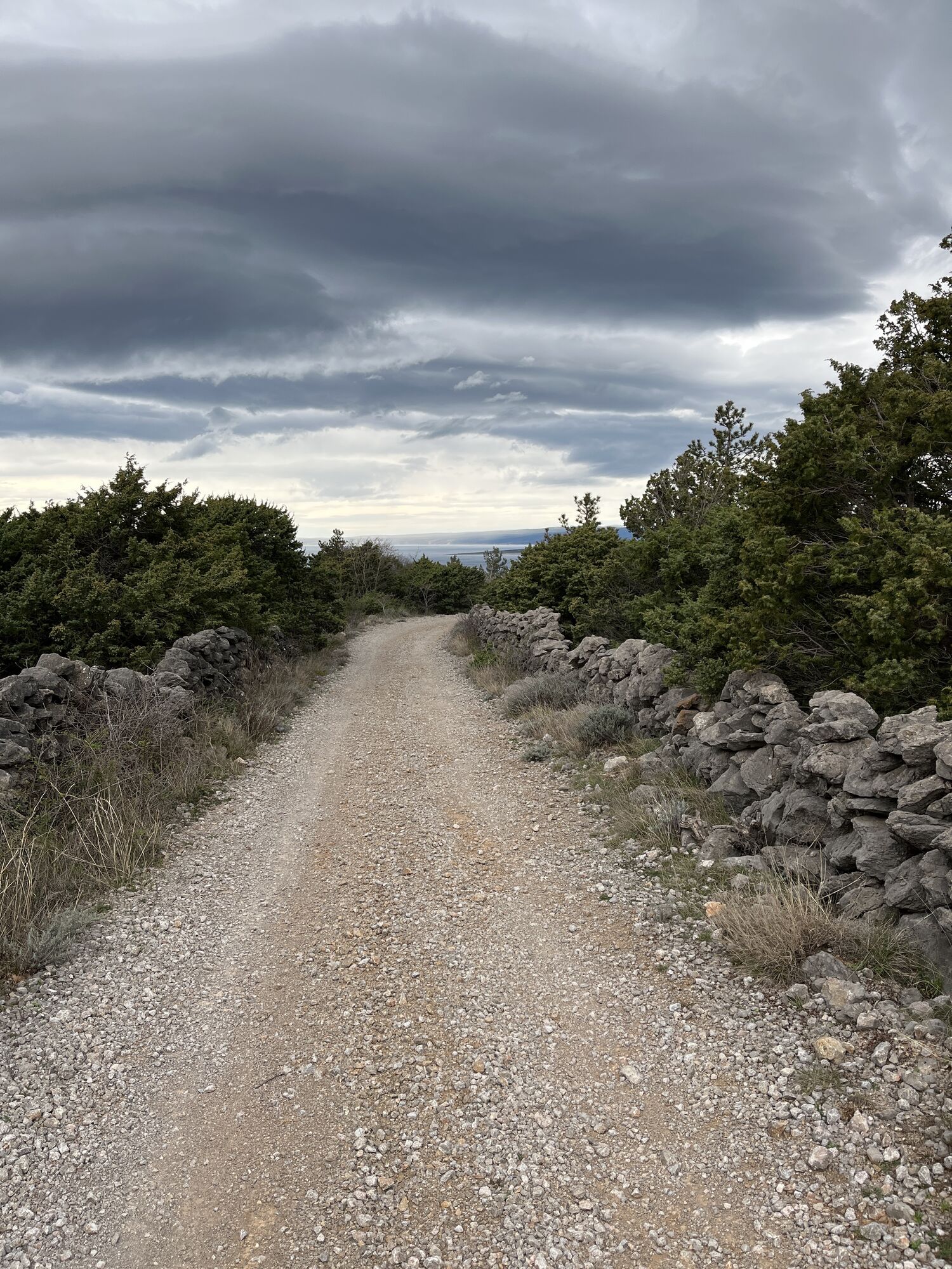 Zurück zum Bikedepot und auf anspruchsvollen Single S2 Richtung Punat. Bei der Einmündung in die Forststraße fahren wir aber nicht links nach Punat, sondern rechts den ebenen Übergang. Nach der Stelle bei der Steinmauer geht es rechts zur Hauptstraße hinüber.