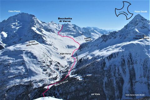 Von Arnoga aus, in der Nähe des niedrigen Parkplatzes, erreicht man das Val Viola, indem man dem alten Saumpfad folgt, der flach bis zur Baite di Campo führt. Weiter geht es bis zur Abzweigung ins Val Verva, die hinunter zum Fluss Viola führt. Nachdem man die Brücke überquert hat, beginnt der Weg nach einem kurzen Auf und Ab wieder anzusteigen und man erreicht die Nähe der Baite di Verva-Hütten. Man geht auf der rechten Talseite weiter und folgt weiterhin der kleinen Straße, bis man die Verva-Alm erreicht und auf derselben Talseite weitergeht. Fünfhundert Meter vor dem Verva-Pass biegen wir allmählich nach links ab und erreichen den Fuß der westlichen Hänge der Cima Piazzi; wir halten einen guten Abstand nach Südosten und erreichen den Verva-See, den wir vorzugsweise links umrunden. Von hier aus ist das Tal gut sichtbar, und in südlicher Richtung steigt man ohne besondere Probleme bis zur Rinne auf.
