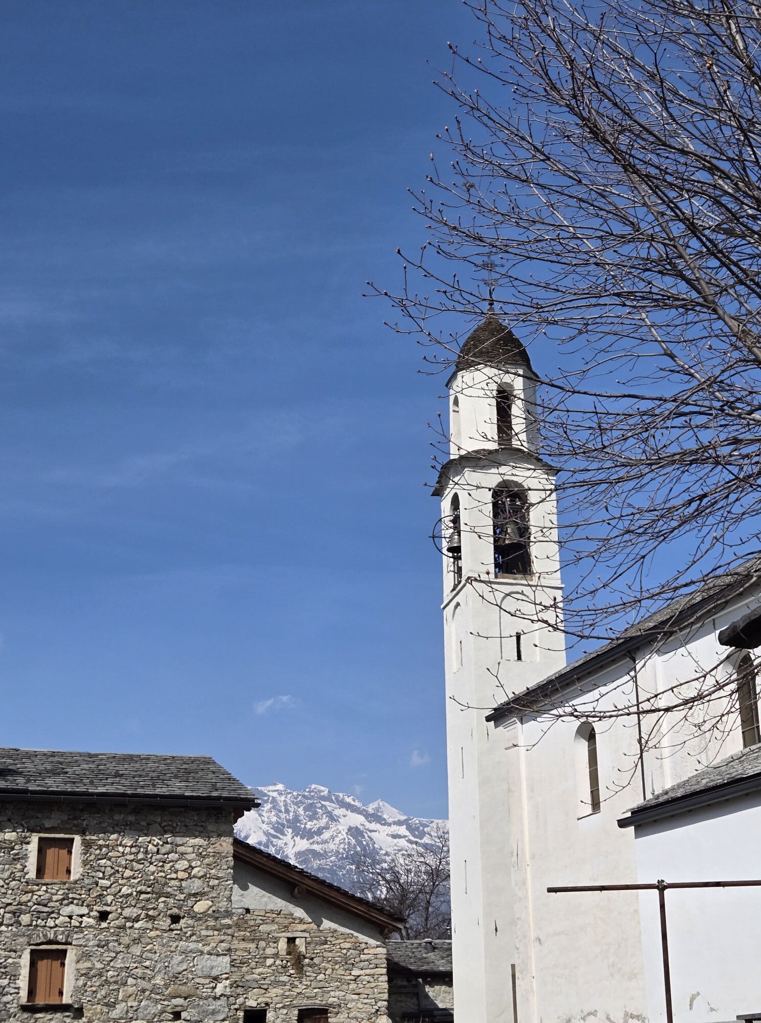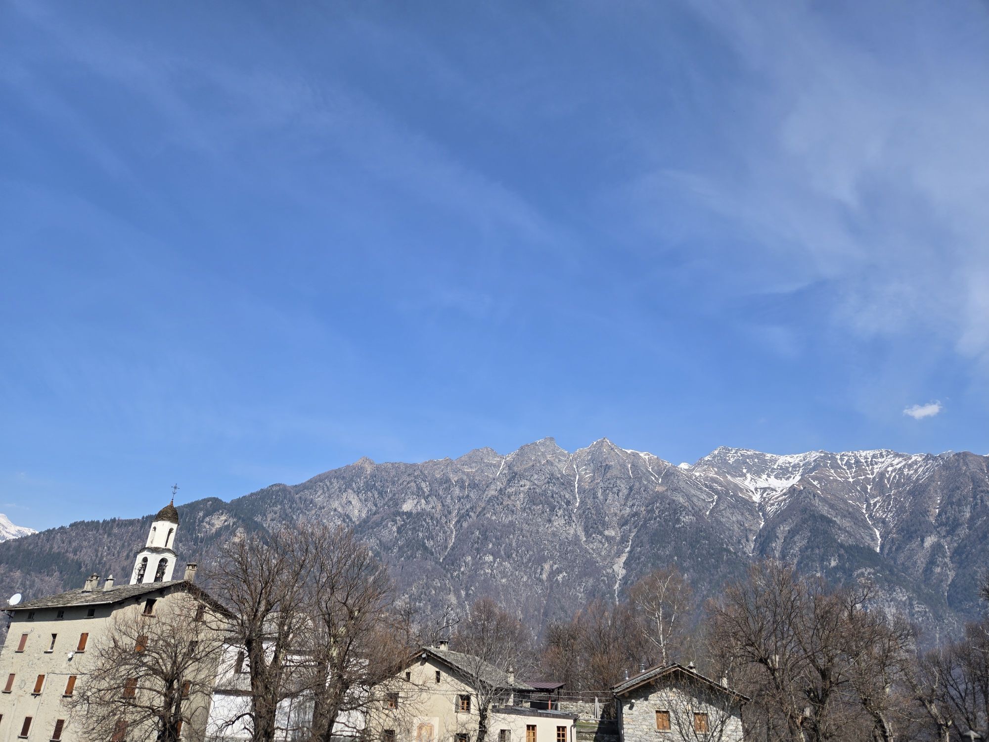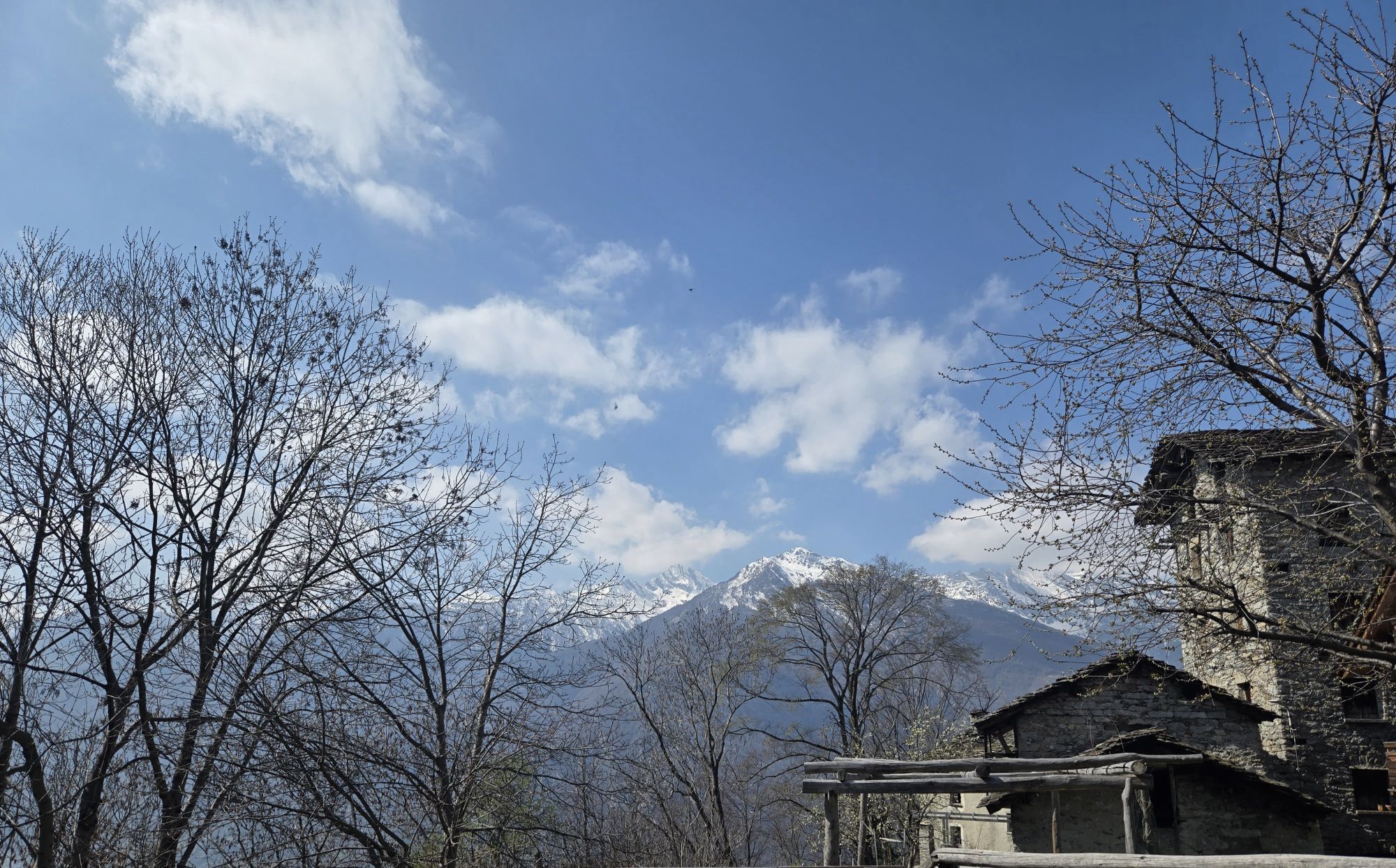 Der Wanderweg besteht aus zahllosen Stufen. Er ist ziemlich leicht und für jeden begehbar. In etwa fünfzehn Minuten führt er zu den Wiesen des „Belvedere“ (470 m), von denen man einen wunderbaren Blick auf Chiavenna und die Einmündung der drei Täler genießt. Über Chiavenna ist gut das Dorf Pianazzola sichtbar, und höher oben das Kreuz von Dalò. Wir setzen den Weg fort, der in den Wald führt, vorbei an einem alten Specksteinbruch, bis zu einem großen Felsen nahe einer Quelle, der von den Einheimischen „sass che gota“, also tropfender Stein, genannt wird. Kurz danach lichtet sich der Wald. Hier sind die Hütten der „contrada Zarucchi“ und gleich danach die der „Pighetti“, deren schöne und alte Bauten den Kern von Uschione bilden. Ich liebe es, über die Ebene zu spazieren, um die sich das Dorf gruppiert.