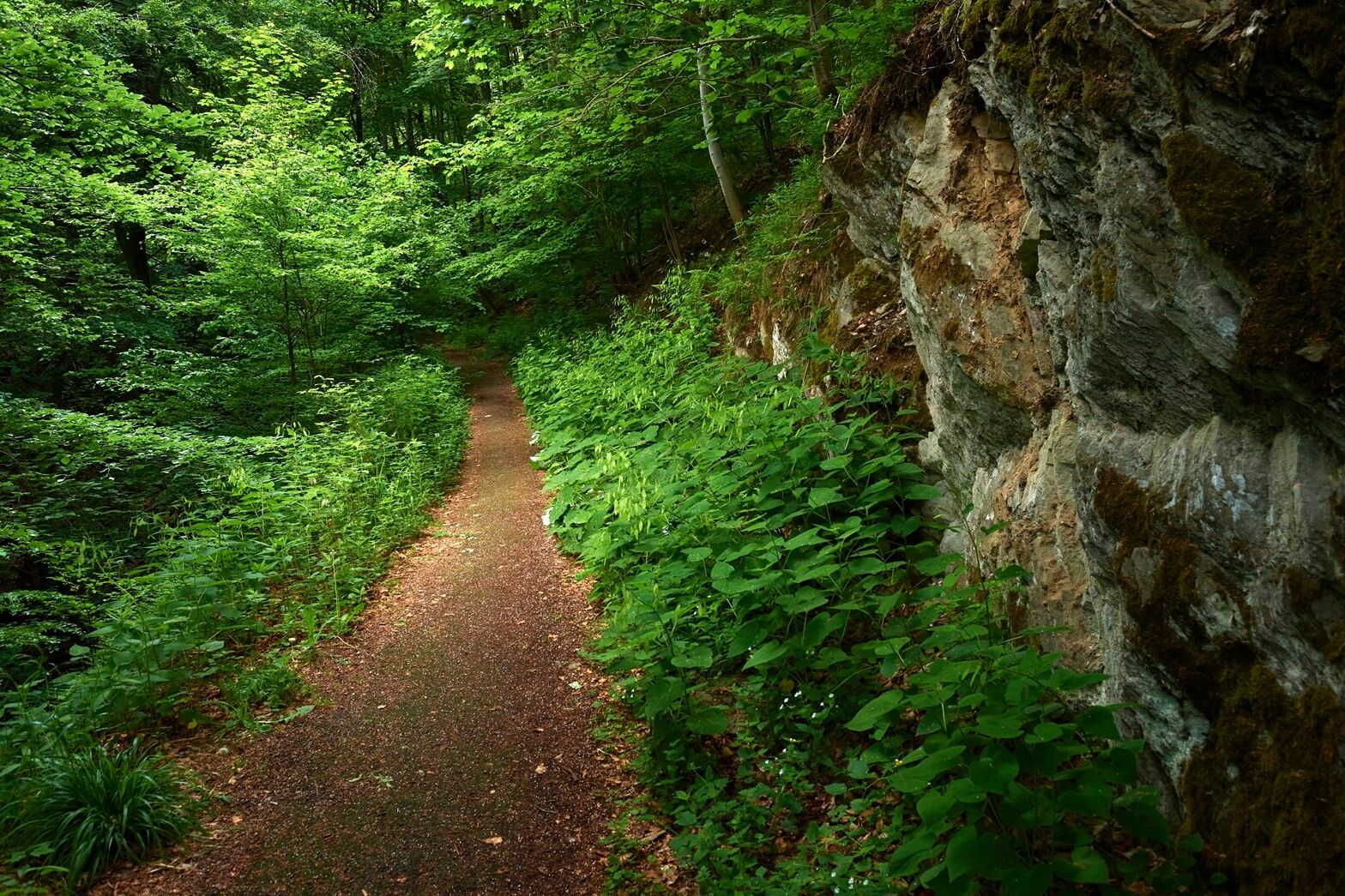 Von Küstelberg aus verläuft der Rothaarsteig westwärts und durchquert den ehemaligen Steinbruch Wagenschmier auf einem schmalen Pfad.