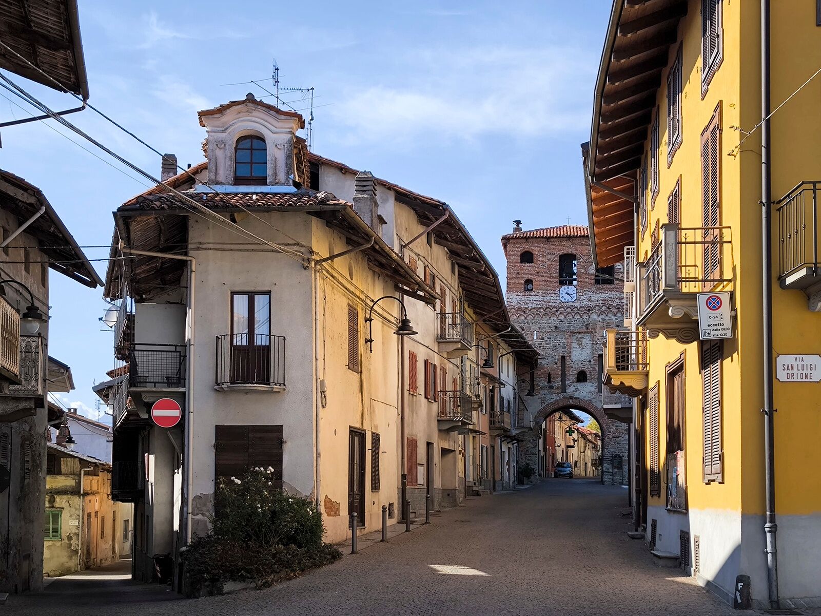 Azeglio: Der einladende Hauptplatz beherbergt den Glockenturm, einen der höchsten im Canavese mit seinen 52 Metern Höhe, hinter dem sich plötzlich eine enge Gasse öffnet, die zum Schloss führt, das einst auch Massimo d’Azeglio gehörte.