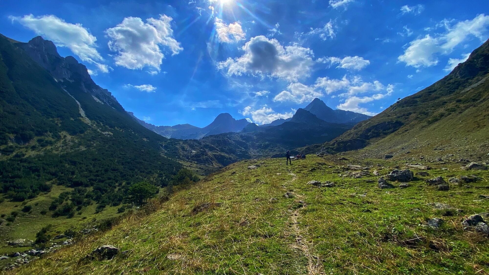 Von Limonetto (Friedhof) folgen Sie der GTA, die dem Karrenweg nach Tetti Virolà und dann nach Ciabot di Pedù 1665 m folgt. Gleich hinter der Alm wandert man auf dem Weg und erreicht das Gebiet von Pian Madoro. Unter Beibehaltung der Route der GTA steigt der Weg neben dem Bach an und führt zu einem Plateau auf 2073 m, wo sich die Route teilt. Man verlässt die Abzweigung nach links zum Monte Ciamossero und steigt zum Giotto-Mien-Pass auf 2270 m auf. Von hier aus geht es über einen steilen Weg hinunter zum Lago degli Alberghi (2039 m), der an einigen Stellen mit Seilen ausgestattet ist. Mit einem langen Abstieg ins Vallone degli Alberghi erreicht man Palanfrè (1394 m), das Ende der Etappe und eine Übernachtung.
