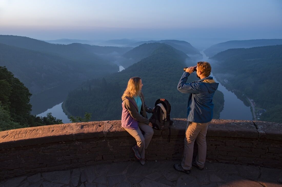 Beim Naturdenkmal „Orkelsfels“ haben wir Orscholz erreicht. Der Weg führt am Ortsrand vorbei zum „Cloef-Atrium“ mit Tourist-Info, Gastronomie und Ausstellungen. Von dort sind es noch 500 m zum berühmten Panoramablick auf die Saarschleife. Wir steigen nun langsam hinab, immer wieder unterbrochen durch grandiose Blicke auf das enge Tal der Saarschleife, über spektakuläre Pfade, zu unserem Etappenziel in Mettlach. Dort gibt es zahlreiche Sehenswürdigkeiten und eine große Auswahl an Restaurants. Von Mettlach werden Schiffsfahrten in die Saarschleife angeboten.