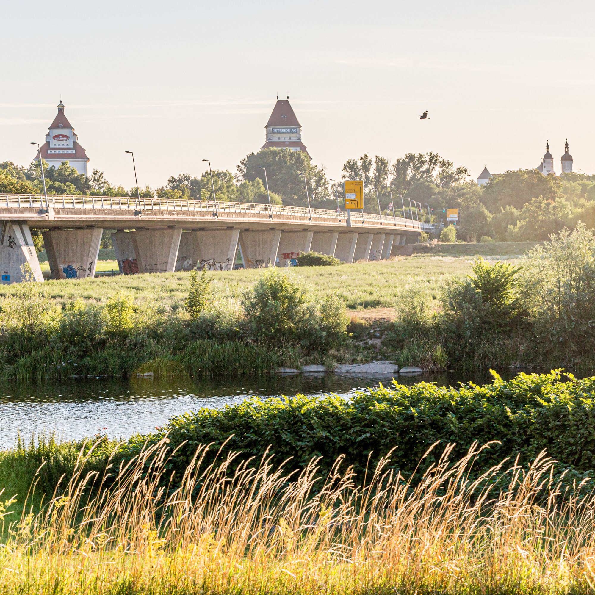 Der Zusammenfluss der Freiberger und der Zwickauer Mulde bei Sermuth ist ein fantastischer Ausgangspunkt, um die Tour entlang der Vereinigten Mulde zu starten. Auf wenig befahrener Straße geht es zunächst gen Norden bis Kössern. Hier können wir am Rittergut eine kurze Rast einlegen oder der Hauptstraße Richtung Großbothen folgen. Nach der ersten Muldeüberquerung folgen wir dem Straßenverlauf nach Kleinbothen, im Ort biegen wir links und kurz darauf wieder rechts ab. Am Freibad fahren wir links vorbei und gleich wieder rechts auf den geschotterten Pfad. Nun folgen wir dem Waldweg ganz nah an der Mulde, vorbei am Geoportal Schaddelmühle und dem Fähranleger bei Höfgen, bis zum Kloster Nimbschen. Wir folgen dem asphaltierten Weg weiter, bis wir die Bundesstraße überqueren und fahren dann den Weg weiter bis zum Ortseingang Grimma. Wir wechseln die Straßenseite und fahren unmittelbar auf der rechten Seite den (steilen!) Berg hinunter, gleichfalls immer geradeaus, vorbei an der blauen Grimmaer Hängebrücke, direkt in den historischen Stadtkern. Wir halten uns nun rechts und überqueren im Stadtzentrum die ausladende, historisch restaurierte Pöppelmannbrücke. Gleich hinter der Brücke halten wir uns wieder links an der Mulde und folgen dem asphaltierten Weg auf der ehemaligen Bahntrasse. Auf den folgenden 16 nahezu schnurgeraden Kilometern kreuzen wir unter anderem die Papierfabrik Golzern, fahren an den mächtigen Betonpfeilern der Autobahn 14 vorbei und folgen dem Verlauf über Neichen und Nerchau vorbei durch eine fantastische Muldeauenlandschaft. In Dehnitz halten wir uns ortseingangs rechts und fahren gleich wieder links. Entweder wir rollen nun direkt auf die Stadt Wurzen zu oder statten rechterhand dem Wachtelturm einen Besuch ab, von dem wir den Blick weit in die wunderbare Muldenlandschaft schweifen lassen können.