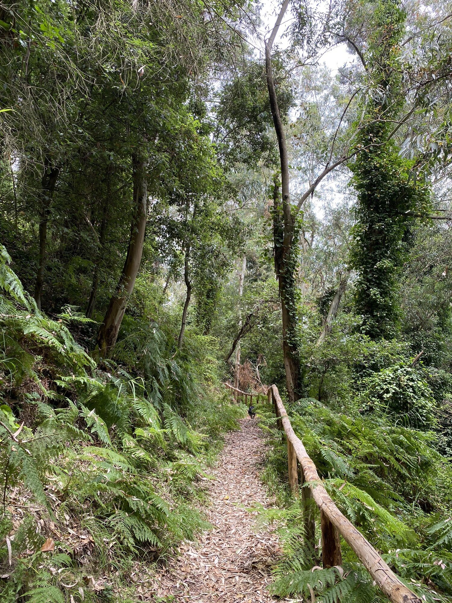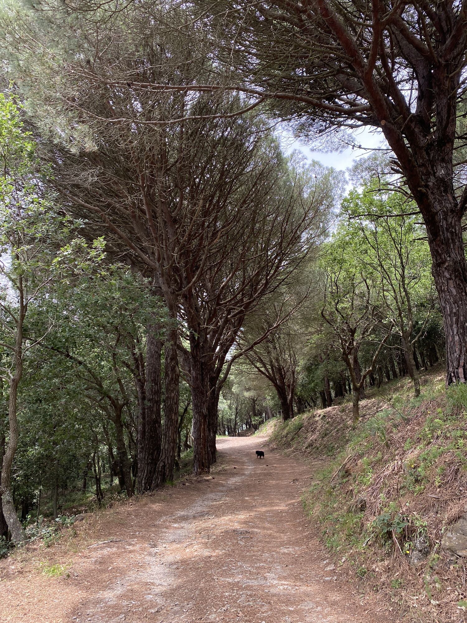 Danach führt einen der Weg durch Pinienwälder weiter bis man zu einer Abzweigung kommt. Hier kann man zum Gipfel gehen, es ist nur ein kurzes Stück. Oder man geht direkt den Weg mit dem Holzzaun weiter bergab. Nach wenigen Minuten kommt man beim zweiten Rastplatz vorbei. Num folgt man dem Weg bis zur nächsten Gabelung, dann biegt man nach rechts ab. Hier wird das Gelände etwas wilder, man befindet sich aber auf dem richtigen Weg. Ein kurzes steiles Stück bergab und man kommt am Anfang der Tour wieder auf den Weg zurück.
