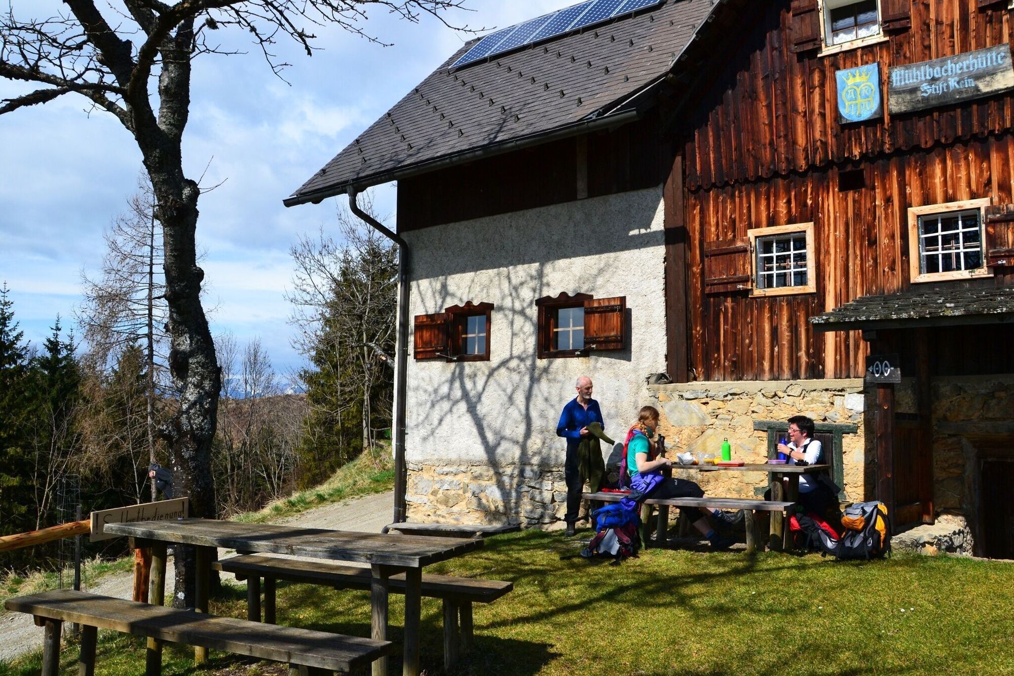 Sollte man die Mühlbacher Hütte außerhalb der Öffnungszeiten erreichen, kann man sich im Winterraum etwas zu trinken kaufen - Kleingeld mitnehmen! Es gibt eine Bank mit schöner Aussicht (beim "Apfelstein") auf dem Kaschlsteig, welche zur Rast einlädt.