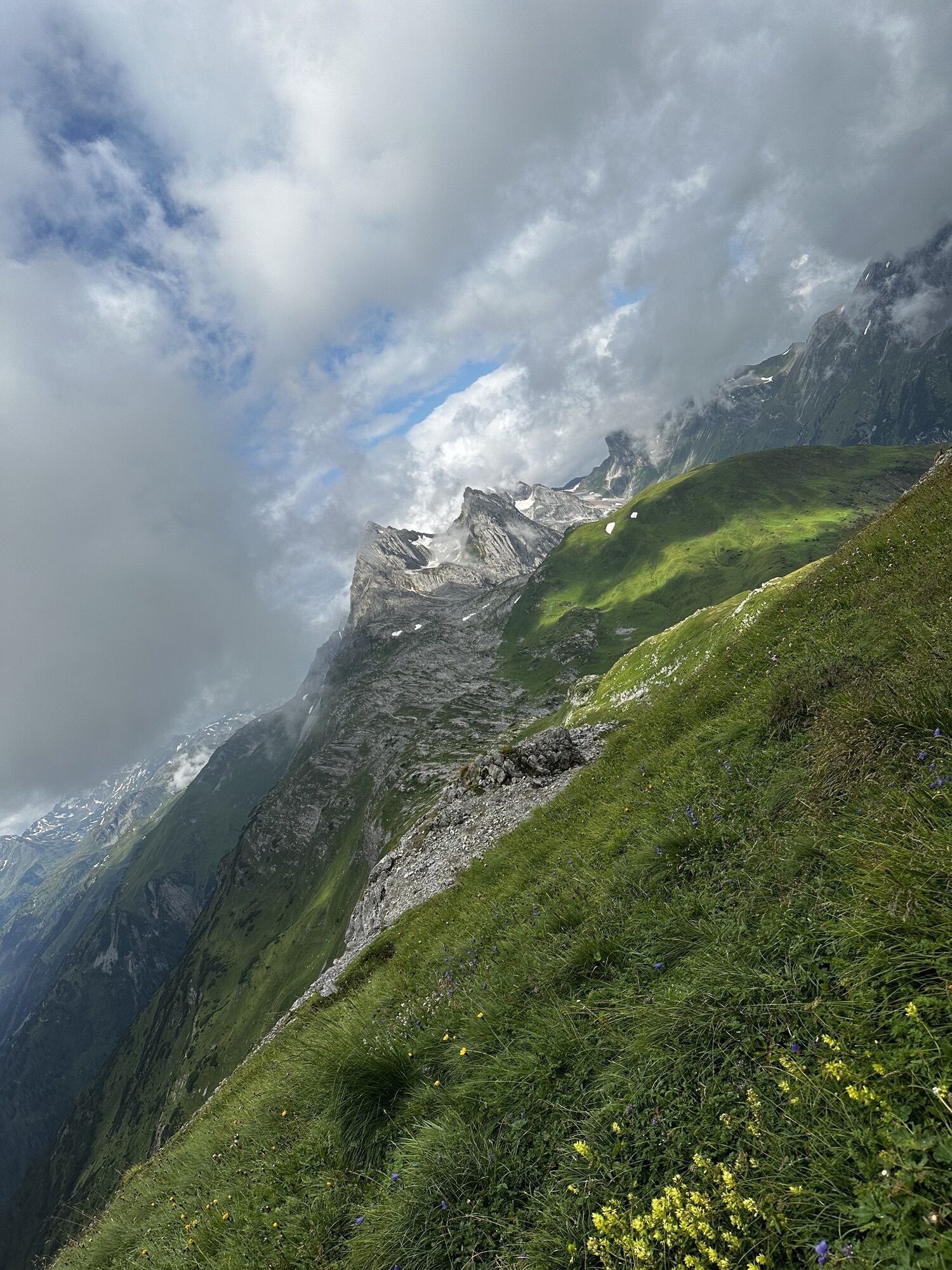 Danach steigen wir wieder ab zum Kaiserjochhaus und folgen nun dem Adlerweg (Nordalpenweg) entlang Richtung Leutkircher Hütte. Wir erreichen dort recht bald den Schindlesattel und besteigen von hier aus weglos den Schindlekopf und den Bergleiskopf.
