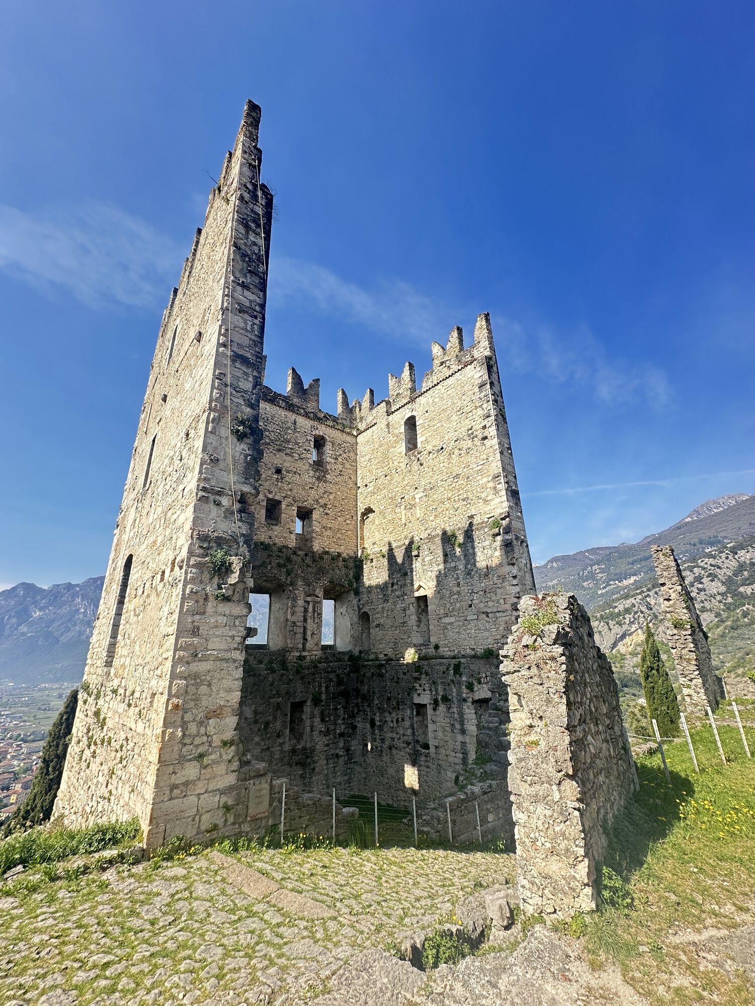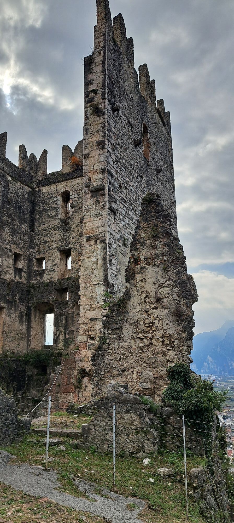 Vom Aussichtspunkt gehen Sie rechts hinunter und nehmen den Weg von Busa dei Capitani (unten an der Treppe links abbiegen), der zu einer großen Lichtung (einem weiteren Aussichtspunkt) führt. Bleiben Sie rechts auf der breiten Forststraße, und etwas weiter finden Sie links einen Pfad, der nach Castagneto di Nago führt. Von hier geht es hinunter nach Nago, achten Sie auf den kurzen, steilen und gesicherten letzten Abstieg. Sie durchqueren das Zentrum von Nago in Richtung Forte Alto und folgen weiter dem Schotterweg (Via Castel Penede), der die gleichnamige Burg umgibt. Schließlich geht es entlang der alten Strada di Santa Lucia hinunter nach Torbole. Vom Zentrum von Torbole ist es nicht weit bis zum Ausgangspunkt.