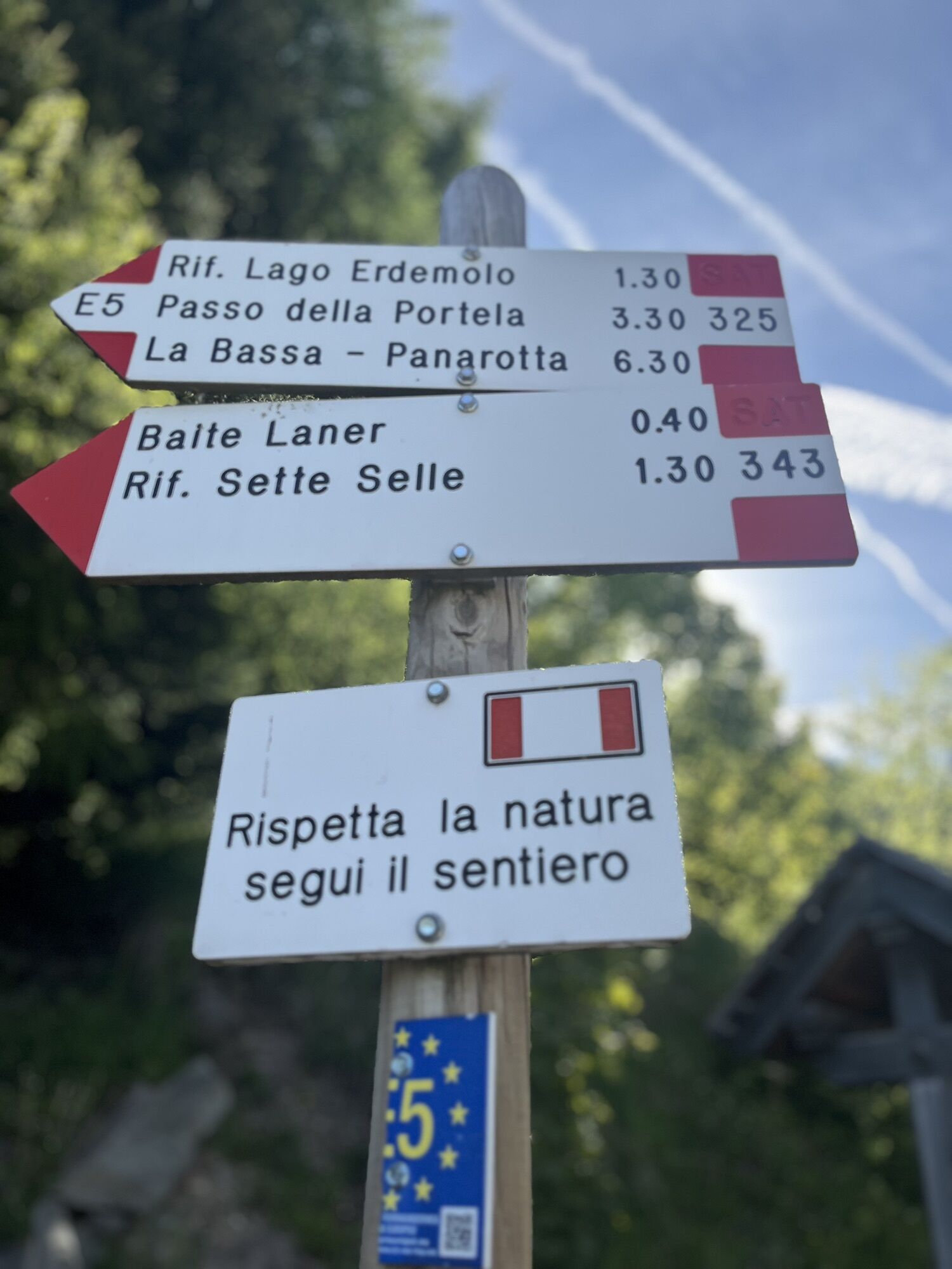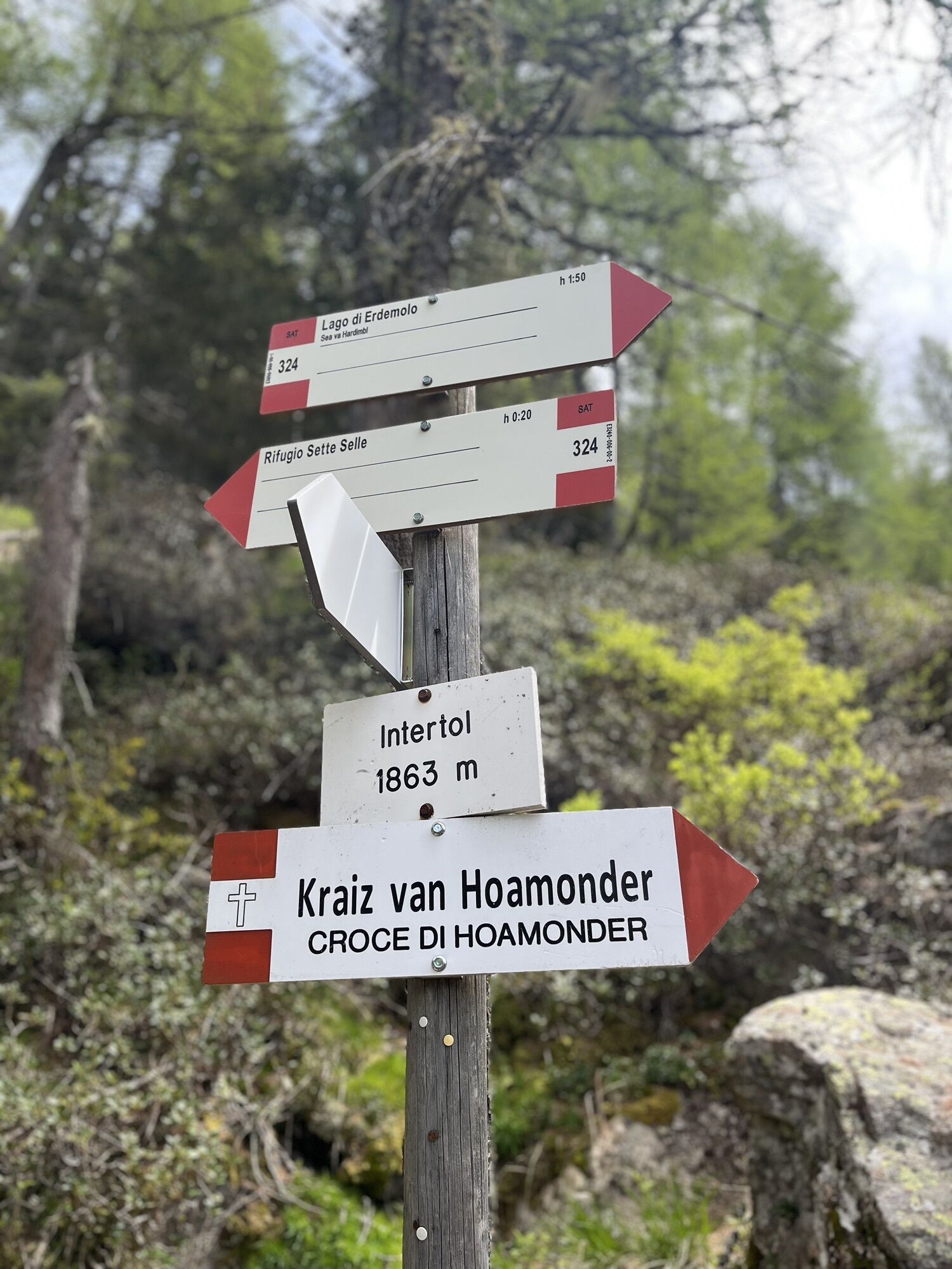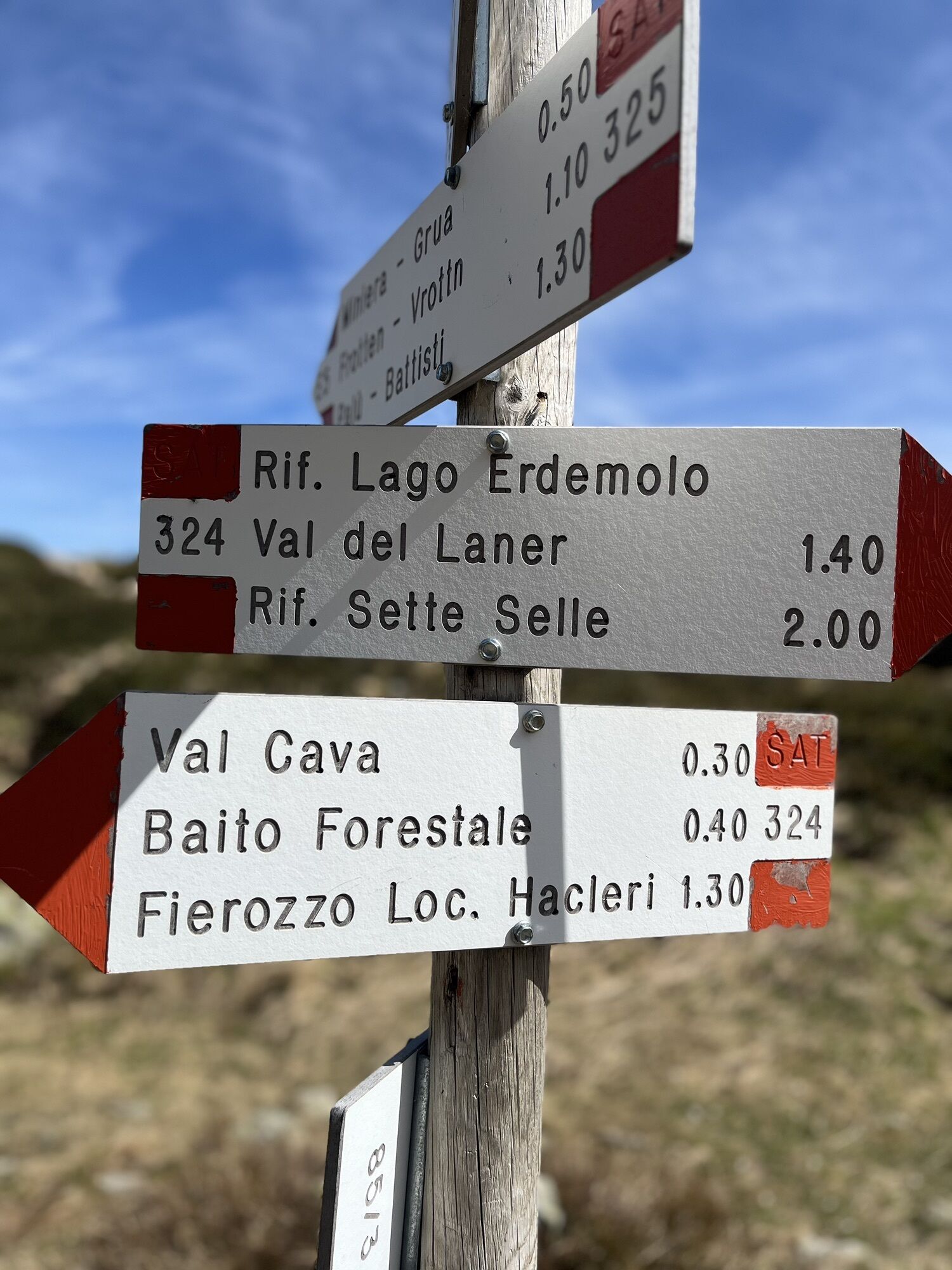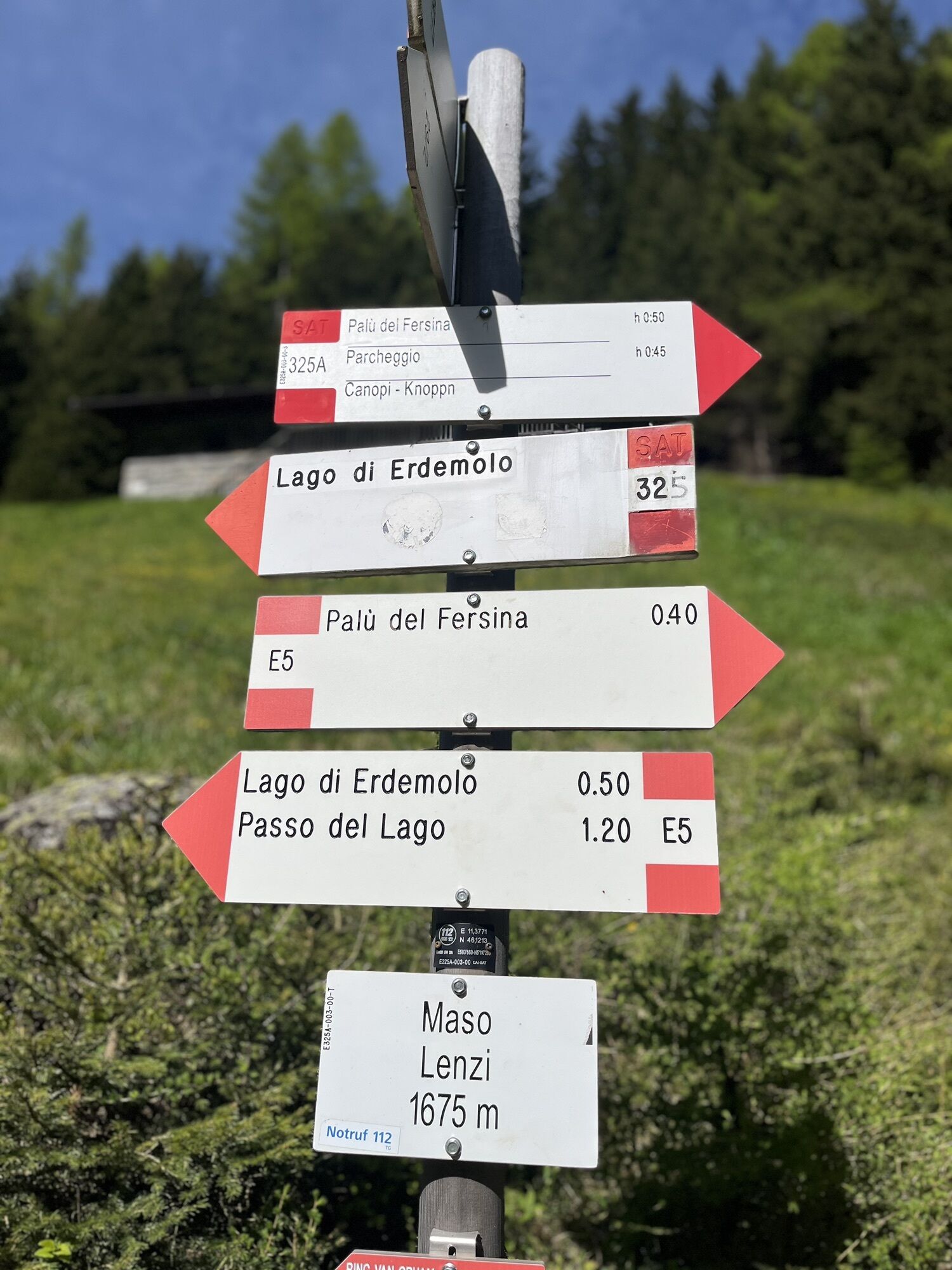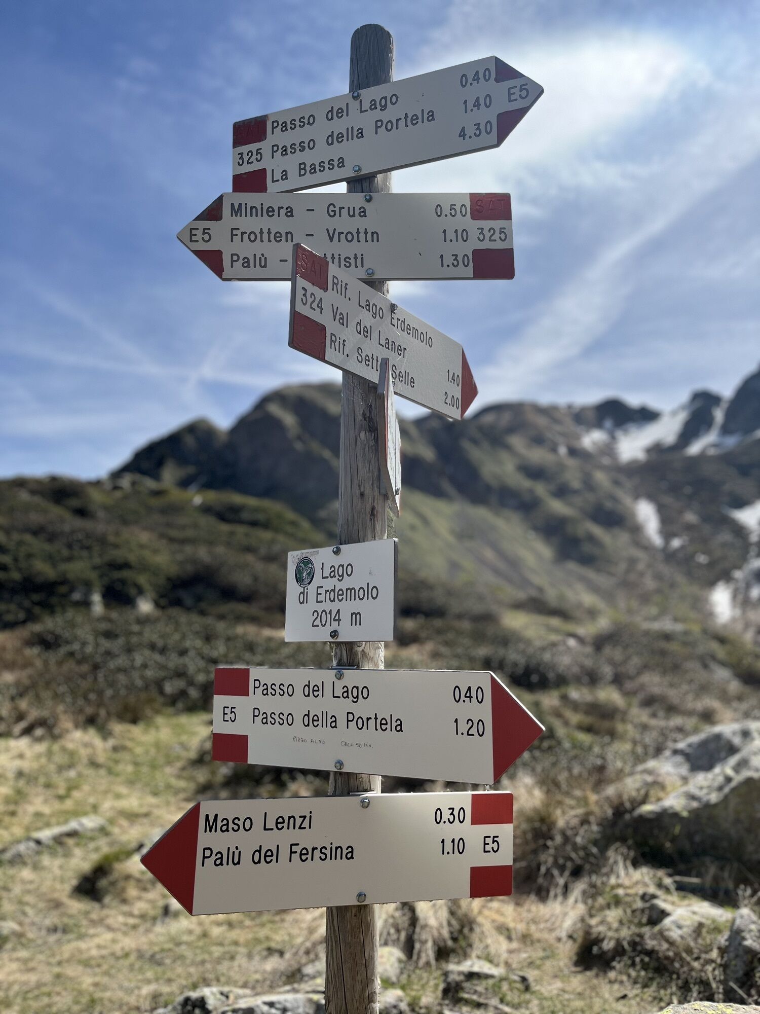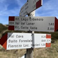 Partenza il parcheggio Frotten. Sentiero 325 per il lago di Erdemolo e da lì 324 fino al rifugio Sette Selle(esposto da un lato). Da rifugio 343B in discesa e riconessione col 325.