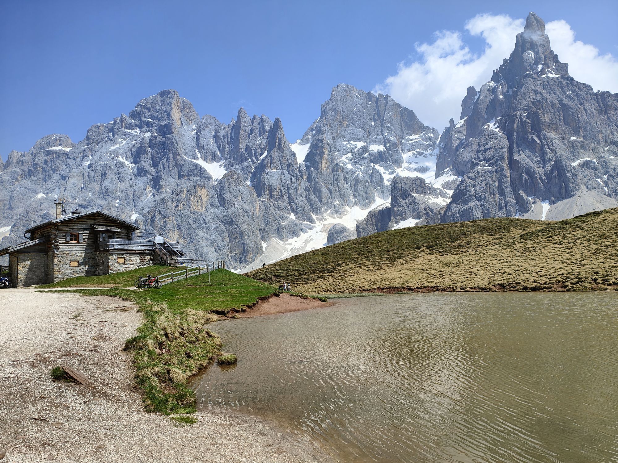 Auf der bequemen, leicht ansteigenden Forststraße kommen Sie zunächst linkerhand nahe der bewirtschafteten Sennalm Malga Venegia und anschließend rechts, an der Malga Venegiota vorbei. Der Weg, im Süden mit den senkrecht aufragenden Wänden der Dolomitengruppe Pale di San Martino, wird steiler und führt in Serpentinen zur bewirtschafteten Berghütte Segantini hoch. Die Aussicht von dort ist atemberaubend.