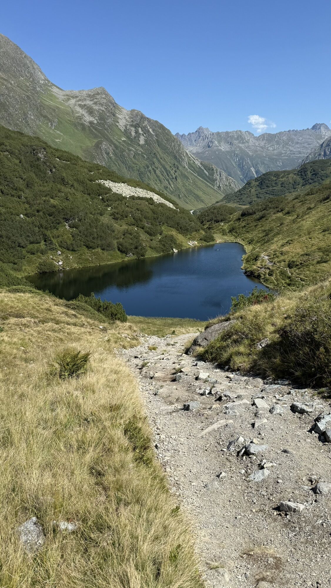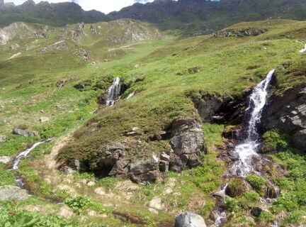 Ansonsten führt der weg nun links vorbei Richtung Westen hinunter auf Schnee oder Steinen. Am Fuße des Berges nun geht es wieder etwas mehr rechts Richtung eines kleinen Sees. Man kann aber auch zum größeren Brüllender See, dieser liegt eher westlicher. Man sieht in dieser Gegend nun auch gut die Heilbronner Hütte im Norden. Der Abstieg ins Verbellatal ist unschwierig und geht über unzählige kleine Bäche.