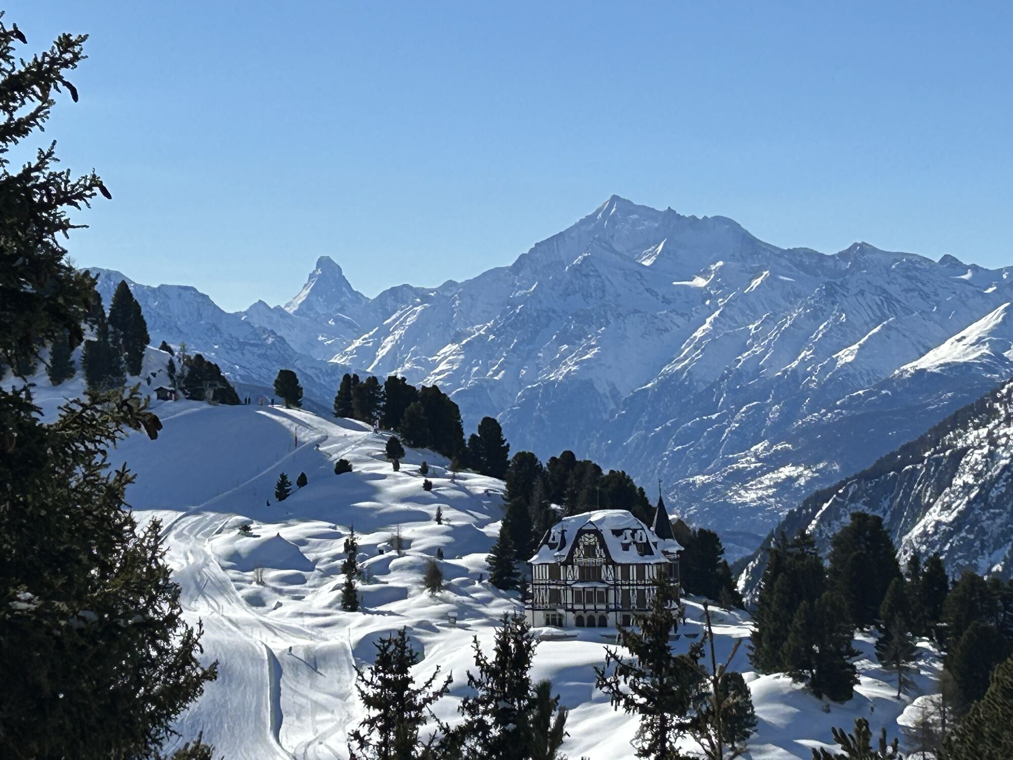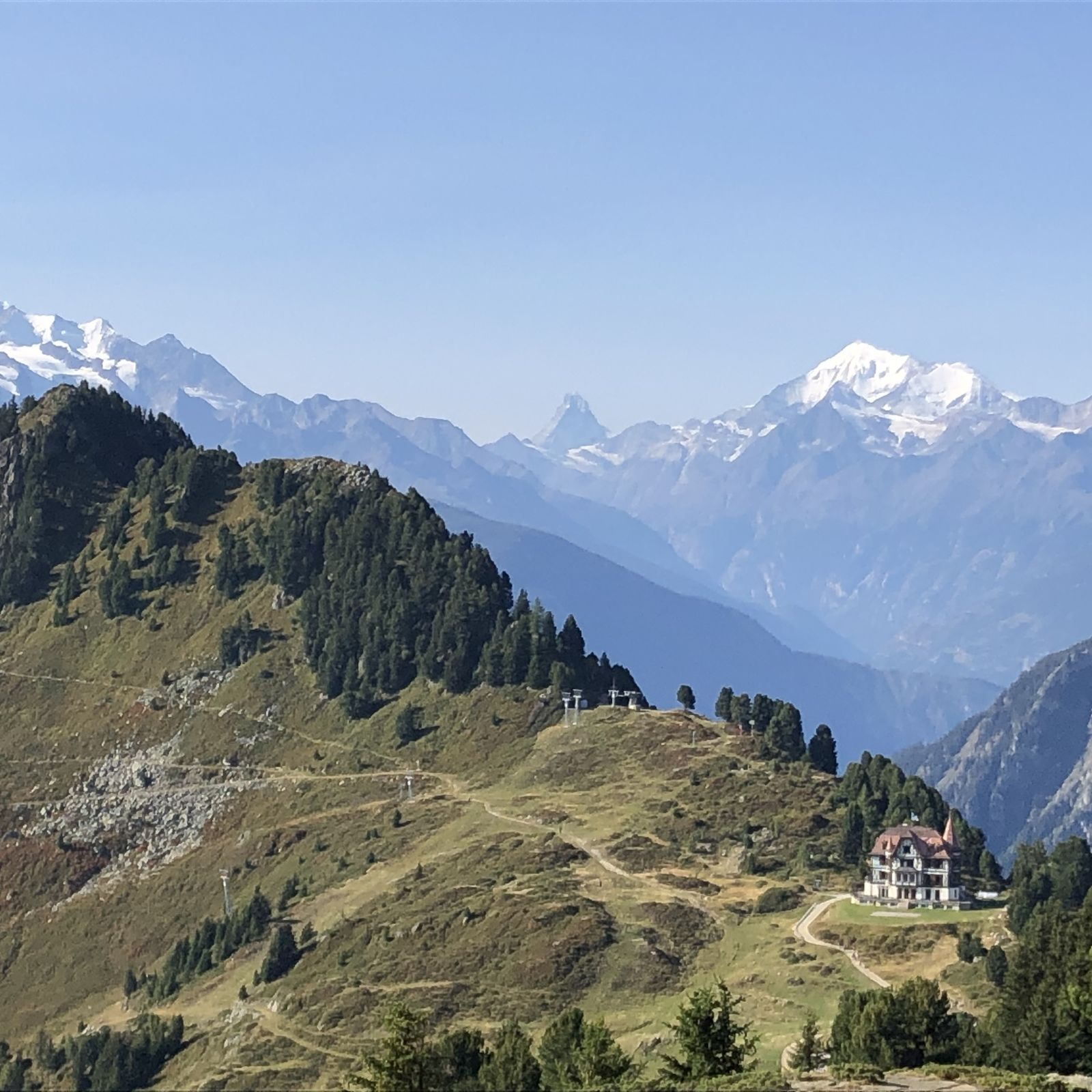 villa Cassel (but you need to add 30 minute hike from Riederalp to Villa Cassel plus gondola ride up from Mörel) to Moosfluh to